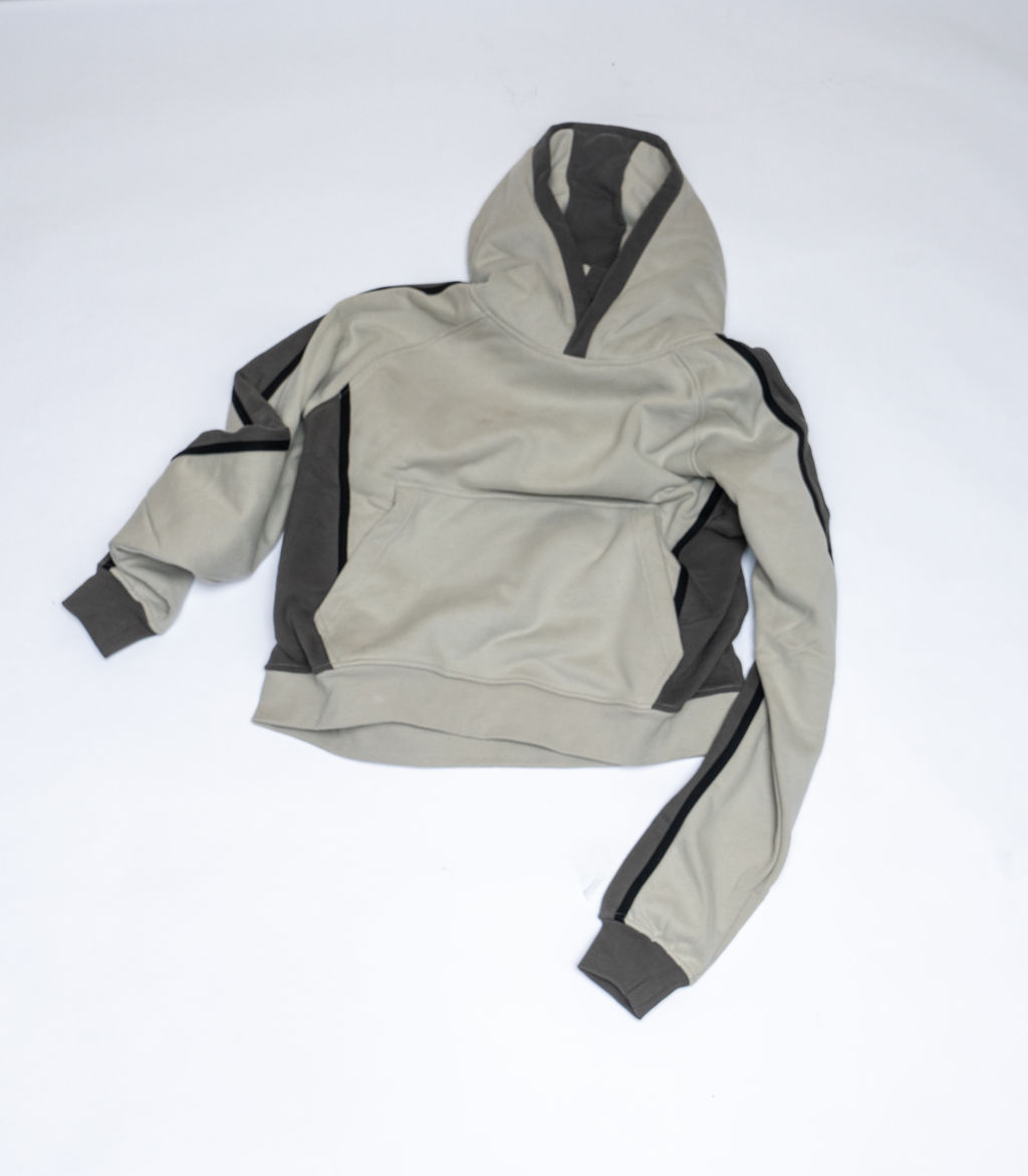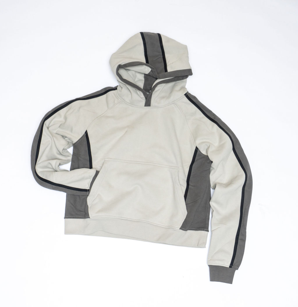 Hooded shirt is light gray, custom design, cotton/spandex/polyester blend. Pullover, long sleeves, black and gray vertical stripes on sleeves, outer hood, side stitched panels, and on back of shirt. Gray vertical stripes uniquely designed on inside of hood and trim. Banded sleeves and waist. Can be paired with gray pants (priced each separate).